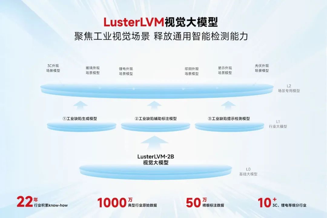 通用工業智能:用得起 用得好在通用工業智能方面,凌云光推出了LusterLVM工業領域通用視覺大模型,釋放通用智能檢測能力。該模型通過分層設計,既滿足了基礎大模型的通用性需求,又針對不同行業和應用場景進行了優化。在缺陷生成、輔助標注和缺陷提示等方面,該模型展現出了卓越的性能,大幅提升工業質檢的效率和精度,而無需依賴大量的算力,能夠快速部署在3C、鋰電等10多種工業視覺檢測環境中。