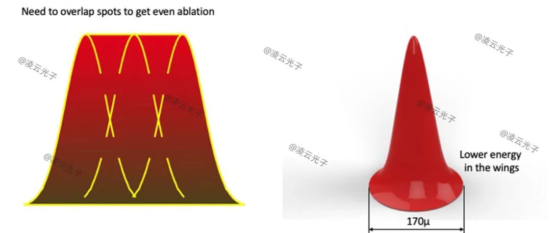激光能量是通過激光光纖輸送的,而不是關節臂。激光束聚焦在170μm大小的微光束光斑上,這些微光束排列成環形,形成由33束微光束組成的“光斑”。光斑具有高斯截面,與其他單模、高光束質量激光器一致。微光束以環形陣列傳輸,固定光斑重疊35%,在整個環空或光斑上形成均勻的能量分布。微光束重疊,使得高斯光束的波谷疊加地為激光光斑提供非常均勻的能量(圖1)。