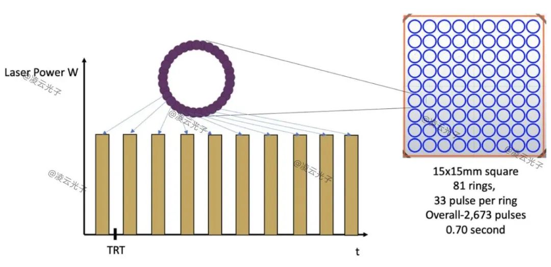 ▲圖2. 激光脈沖33個微光束脈沖組成,脈沖間隔長于治療皮膚中每個微光束的熱弛豫時間。環形脈沖在一個15mm× 15mm的正方形中傳遞,由81個環形脈沖組成,在0.7秒內傳遞。