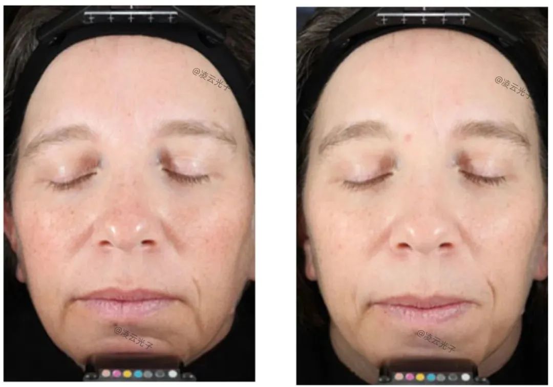 在治療前和最終治療后3個月,使用專業的數字成像系統和標準化的頭部固定器拍攝每位受試者的全臉數字圖像,以保持正確的頭部定位。為了確保在預處理和處理后成像過程中頭部定位的可重復性,成像系統將先前圖像的數字重影與頭部位置的實時電影顯示結合在一起,以實現預處理和處理后數字圖像之間定位的最大一致性。將視頻圖像與靜態虛影圖像進行匹配,實現預處理定位與后處理定位的匹配。在治療前和治療后3個月,每名受試者取3個面部位置,包括正面、左側面部45°和右側面部45°。治療效果由三位盲審醫師評估者比較治療前和治療后3個月的隨機圖像對進行評估,評估者將嘗試識別出治療前的圖像,然后評估治療后3個月圖像的改善水平,如果有的話。盲審醫師評估者使用從0到10的11分量表對光損傷的總體改善進行評分,其中0分對應于沒有改善,1分代表光損傷改善10%,5分代表改善50%,10分對應于100%,或皮膚光損傷完全改善。錯誤地識別處理后的圖像作為預處理圖像,將導致負得分,例如分數為4將被記錄為- 4分,或光損傷外觀惡化40%。