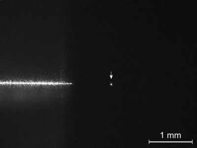 圖為真空中用Koheras BOOSTIK C15發出的激光束捕獲的懸浮納米球(白色箭頭位置)。壓力低于1×10-6 mbar。