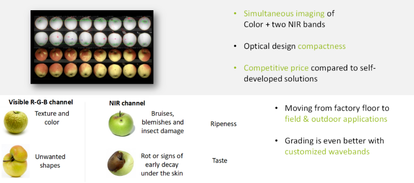 棱鏡相機可見光彩色通道(波長400-670納米)提供精準的水果顏色信息,幫助判斷其成熟度、品種和外觀質量等。近紅外NIR通道(波長750-1000納米)通過近紅外特性檢測水果表面以下人眼無法看到的缺陷。