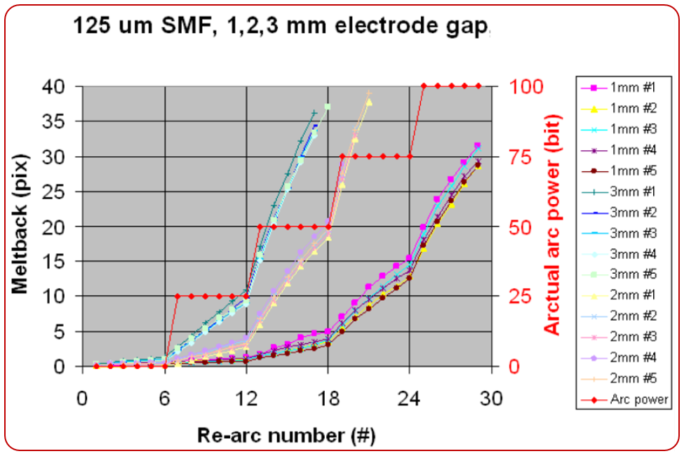 從圖6所示的示例中,可以看到使用前面描述的新放電校準方法,125、220和400um光纖可以在不同的電弧大小設置下用相同的電弧功率設置進行熔接。換句話說,在不同光纖類型和電弧大小設置(電極間隔)條件下,操作人員可以很容易的得到所需的熔接結果,對于任何新型或未知類型的光纖,工程師可以輕松的使用相同的功率設置調整熔接參數,無需繁瑣地尋找合適的放電功率。