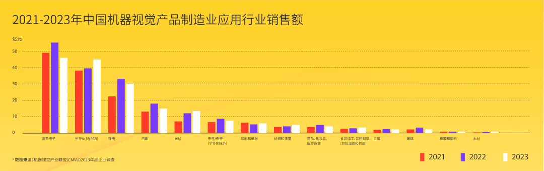 從應用行業來看,制造業仍是機器視覺的主要市場,特別是在消費電子、半導體和鋰電等行業,機器視覺技術的需求持續增長。2023年,消費電子行業占機器視覺制造業銷售額的24.3%,其次是半導體行業(23.4%)。在新能源汽車快速發展的推動下,機器視覺在鋰電行業的銷售額從2021年至2023年年均增長17.3%,2023年占比提升至16.1%。非制造業領域,如智慧交通與安全監控,也表現出強勁增長,成為行業技術應用的新亮點。