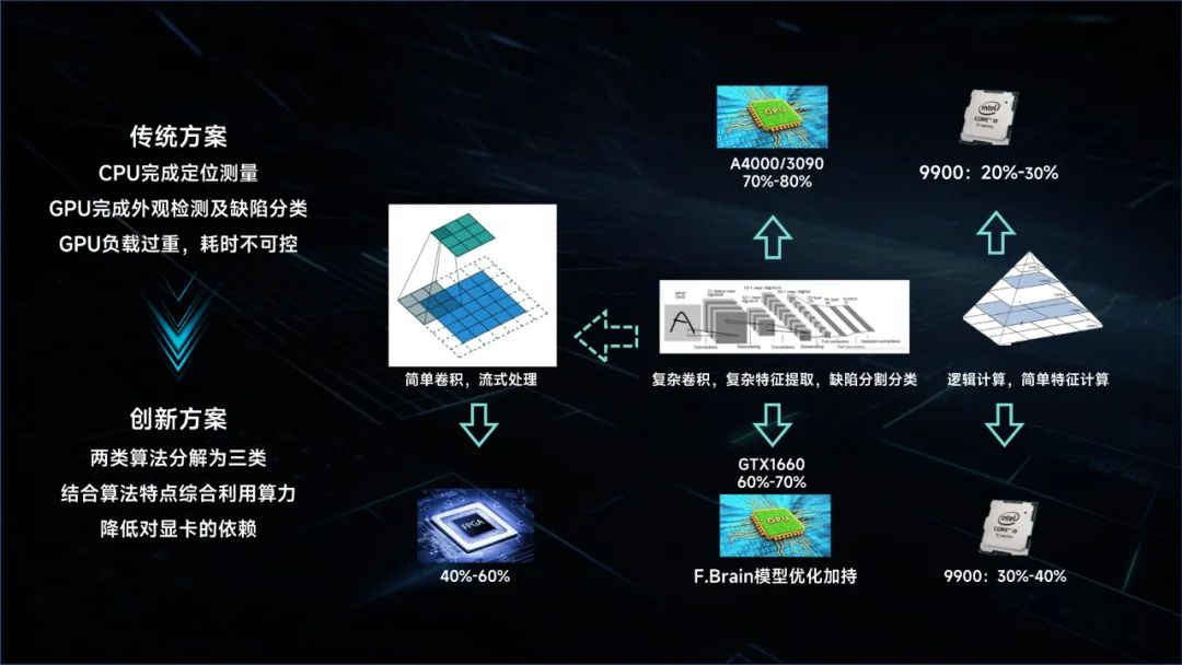 傳統的在線質檢過程一般先通過CPU完成定位測量,再通過GPU完成外觀檢測及缺陷分類,這就導致GPU負載過重,再加上深度學習的需求,GPU更加“不堪重負”。