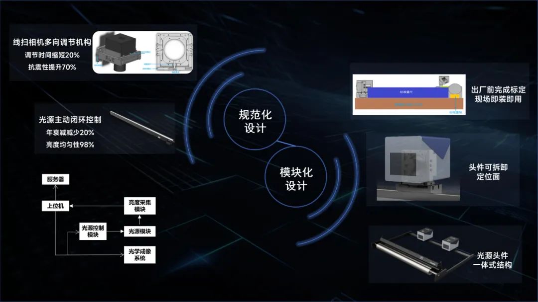 基于此,我們將檢測設備進行了規范化設計和模塊化設計。通過相機頭件和光源的一體化設計實現即插即用,顯著改善成像系統一致性,降低維護成本。