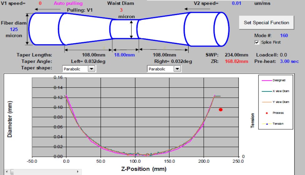 利用拋物線拉錐方制作并測試了直徑3um,長度為230mm的光纖錐