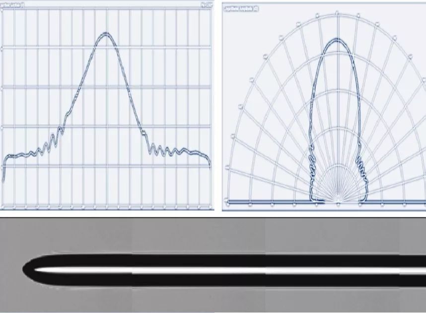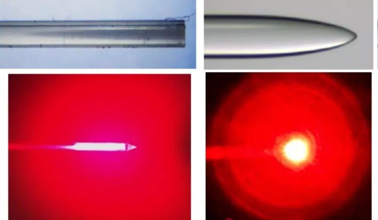治愈癲癇或者小腫瘤腦外科,現在要將顱內不需要的組織進行熱破壞,光在光纖傳輸,是往一個方向傳,若是導管進去定位后,只能將光方向的組織破壞掉,其他方向的還得繼續定位,來回移動,所以這一方案并不可行。而將導管頂部拉成錐形,打出來的光將是四散的,直接將定位附近的組織破壞掉,一步到位。如下圖,光纖尖端直徑由∞→10um,光就越向四面發散。