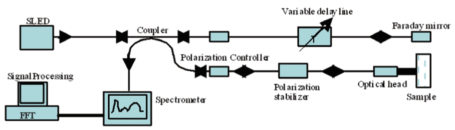 下圖是一個典型的SD-OCT系統圖,基于測量臂與參考臂的干涉光譜與樣品不同深度的背向散射光強度信息恰好是一對傅里葉變換對的關系這一原理,SD-OCT避免了在測量時需要改變參考臂光程長度的問題,而是將代表著樣品不同深度信息的光束統一收集后,通過傅里葉逆變換即可解算出樣品深度的強度信息,實現了樣品軸向信息的并行獲取,從而省卻了軸向掃描。