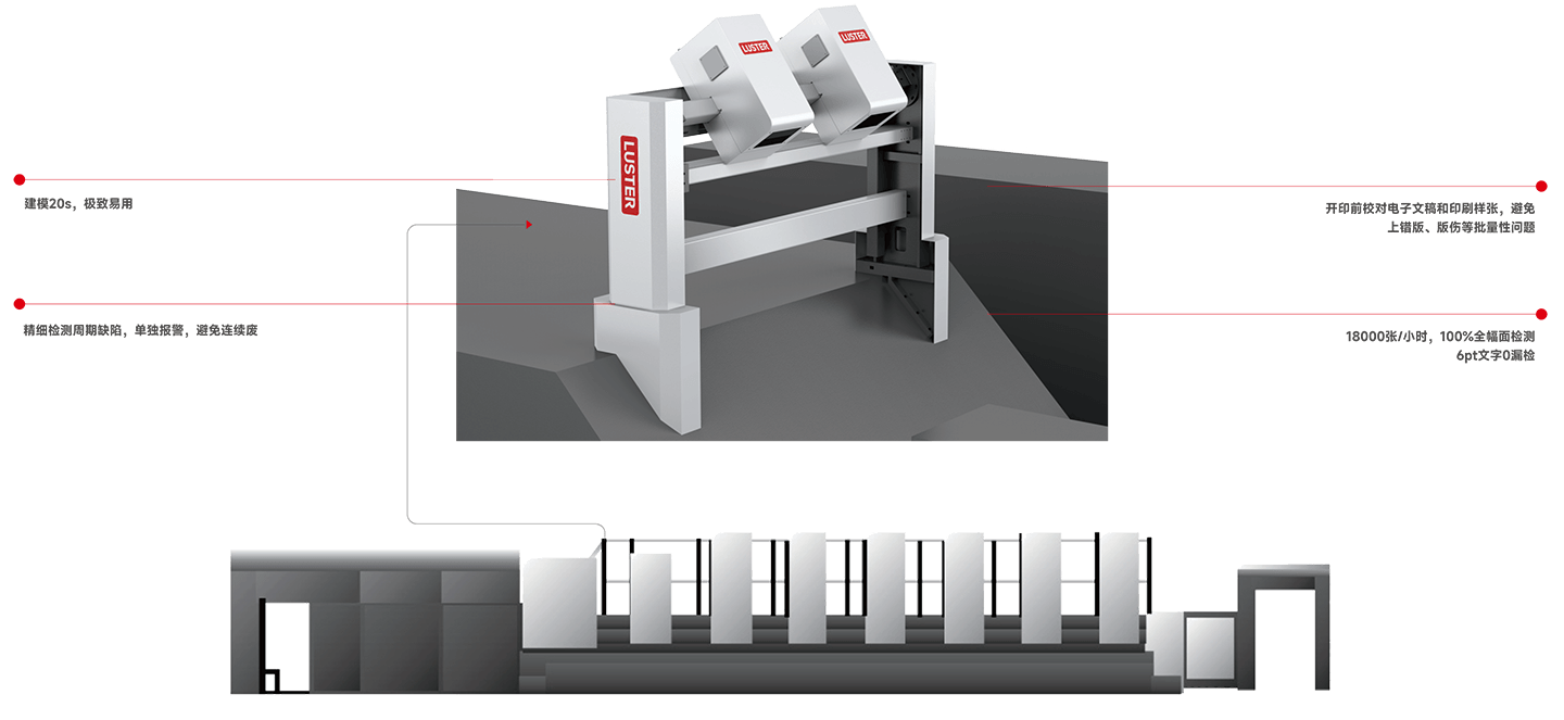 是針對印刷客戶檢測需求研發的高精度、自動化印刷質量檢測系統。該系統可以安裝在印刷機上,在印刷過程中對印品進行檢測,防止連續廢品的產生。系統通過實時采集圖像,圖像分析,發現問題實時報警,電腦界面顯示詳細缺陷信息,提醒機長進行處理。同時還可以選配貼標、劃線等缺陷標記功能,方便后續進行缺陷剔除。