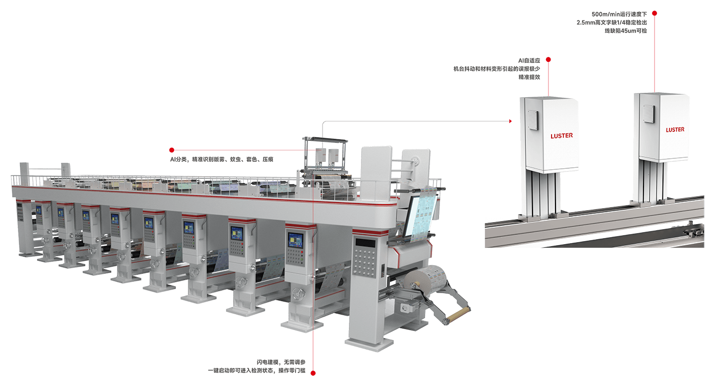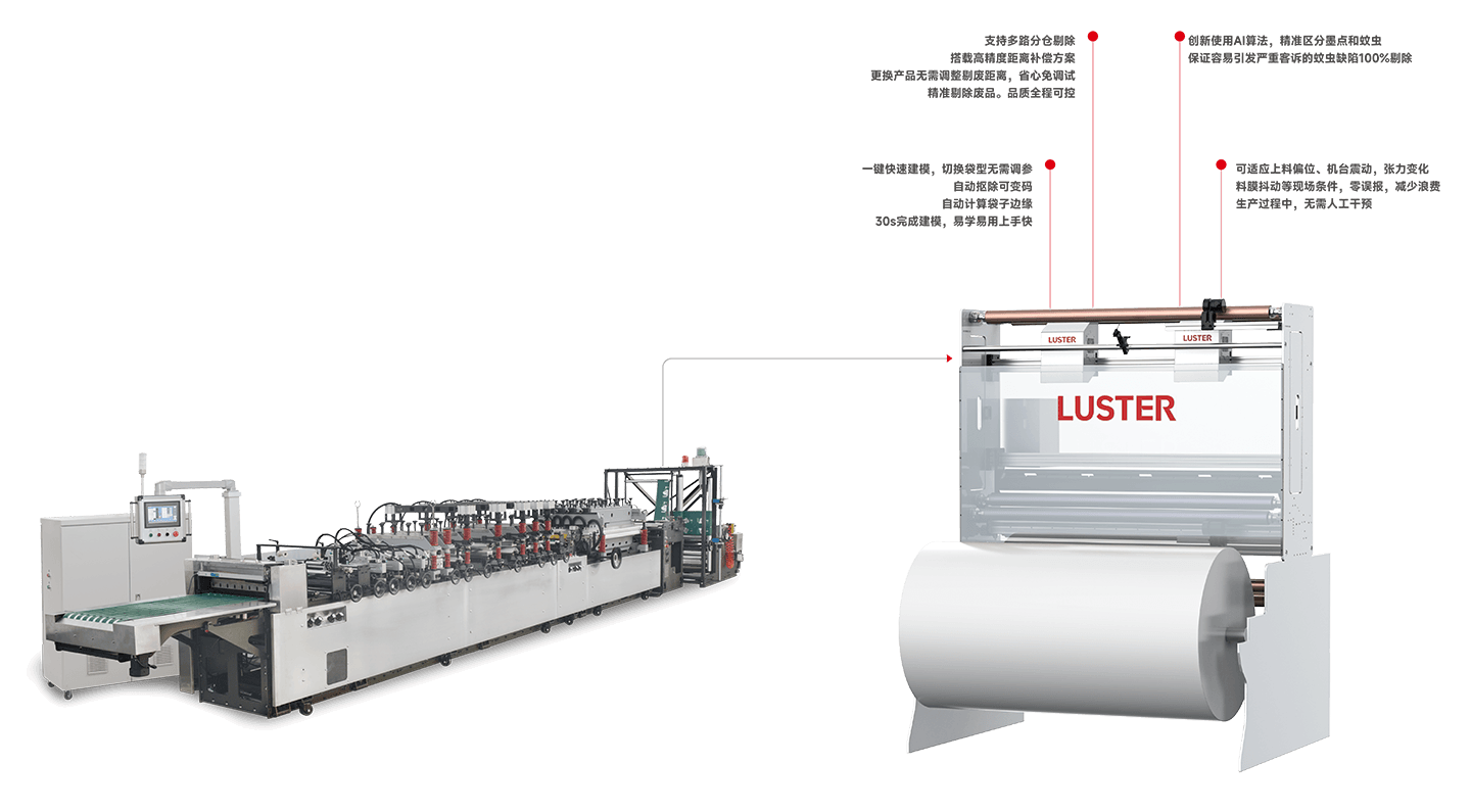 是凌云光基于最新AI算法打造的整體解決方案,專為食品、日化等軟包裝印刷行業的制袋檢測與剔除(理袋)需求設計,適用于所有制袋機型。兼容模切、單刀斷袋、兩刀斷袋的裁切方式,適用于鋁塑復合、紙塑復合、塑塑復合、多層復合等結構的非鐳射材料的檢測。系統可以對檢測到的缺陷進行分級處理,并可針對特定等級缺陷發送剔廢信號。該信號兼容理袋機或獨立剔除裝置進行廢品剔除,同時支持在線貼標、切刀停切(避免切到缺陷位置)等處理方式。