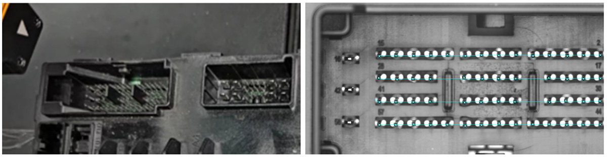 該廠生產(chǎn)BMS、BCM(車(chē)身控制器)及VCU(整車(chē)控制器)等模塊,PIN 針插槽數(shù)量和結(jié)構(gòu)差異大,高度公差0.2mm,XY 偏移精度為0.2–0.5mm。此前,主要通過(guò)人工逐針比對(duì)高度與偏移,PIN針密排導(dǎo)致單板耗時(shí)5–8分鐘,長(zhǎng)時(shí)間作業(yè)還易疲勞漏檢。
